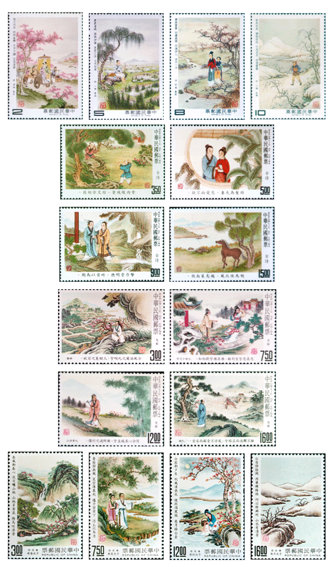 1982年,台湾邮政总局邀请林天时教授以家喻户晓的唐诗入画,完成一套四枚之四季景色邮票,呈现方寸之美,由于意境高远,布局典雅,各诗词相互辉映,充分表现诗中有画,画中有诗的境界,引起广大的回响,促使林教授陆续完成宋词、元曲、诗经、楚辞、乐府诗、古诗等诗画,历时十年,总计创作七套二十八枚邮票。