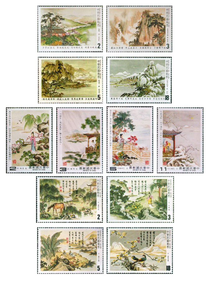 望终南山余雪”,因为当时正在学习画画,而自己收集到的邮票中并没有如此大票幅并且图文如此协调的。不过台湾邮票上面没有志号,也没有台湾邮票目录,所以多年来一直不知道这一系列如此宏伟。直到大学时在广州见到了其中的几套,因为比较贵且大学时也没什么钱集邮就没有买。后来有了台湾邮票目录,知道一共是7组28枚,逐渐在网上买齐。其实台湾邮票相对中国邮票来说性价比很高,同题材的几乎都有很大优势。