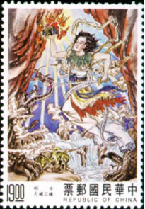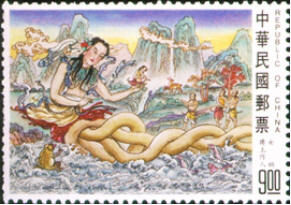 邮票图58女娲炼石补天:往古之时,四极废,九州裂,天不兼覆,地不周载,火爁焱而不灭,水浩洋而不息,猛兽食颛民,鸷鸟攫老弱。于是女娲鍊五色石以补苍天,斩鳌足以立四极,杀黑龙以济冀州,积芦灰以止淫水。苍天补,四极正,淫水涸,冀州平,狡虫死,颛民生。自从女娲创造了人类,幸福的生活万万年,大地上充满着欢声笑语,正如大家都能想到的那样,总会有变化的那天,所谓的物极必反,人类还没有学会人祸的时候遇到的必然是天灾,而这次确实是大状况,擎天柱断了,天破了,遍地水火,人类历史上第一个消防员女娲又粉墨登场,练五色石补苍天,斩鳌足撑起天的四周,恢复了正常的生活。所以她不但是创世主还是救世主,而且并不因所创功绩讹诈后人,堪称典范。