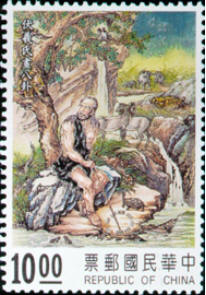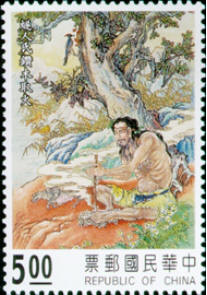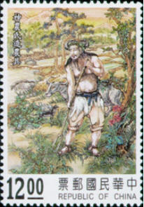 邮票图61神农氏造农具:神农氏也是三皇之一,生具异相是上古传说中人物的典型形象,作为部族首领,他看到人们没有辨识百草的能力,就亲自品尝,从中找出了五谷,作为粮食交给后人种植,使当时的狩猎社会进入了农耕社会,因为农耕需要定居,并且会产生剩余,所以对于人类发展形态至关重要,他创造出农具使得人们会定期劳作,部族逐渐演变为家庭宗族。尝百草的过程中,体察到了植物的药性,排列组合后可以治疗当时人民的疾病,他也是最早的医药学家,中国的自然医药疗法的起源创始人,经过千万年的发展,中医疗法至今也占有着重要的地位,原始时期人类寿命十分短暂,而漫长的中医时代解决了众多的疾病,提高了人们的生活质量。传说中神农氏也是在尝百草的时候中毒身亡,这种献身精神值得后人敬仰。