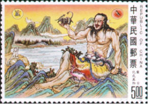 邮票图56盘古化作万物:首生盘古,垂死化身。气成风云,声为雷霆,左眼为日,右眼为月,四肢五体为四极五岳,血液为江河,筋脉为地里,肌肉为田土,发髭为星辰,皮毛为草木,齿骨为金石,精髓为珠玉,汗流为雨泽,身之诸虫因风所感,化为黎甿。