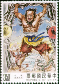 邮票图55盘古开天辟地:天地浑沌如鸡子,盘古生其中,万八千岁,天地开辟,阳清为天,阴浊为地。盘古在其中,一日九变,神于天,圣于地。天日高一丈,地日厚一丈,盘古日长一丈。如此万八千岁。天数极高,地数极深,盘古极长。后乃有三皇。