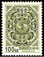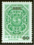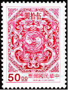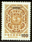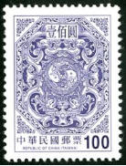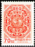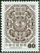 图106-118为台湾夔龙团双鲤邮票。图案参照古迹鹿港龙山寺窗花绘制,以八角型为边,中饰夔龙团双鲤,并于外框加绘花纹,雕刻版印制。