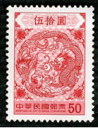 图119为台湾龙凤呈祥邮票。图案以龙凤环绕成圆为设计,底纹为象征吉祥、财富的古钱,龙与凤是中华文化的重要图腾。龙被视为最尊贵的神兽,有召雨丰谷的力量;凤为百鸟之王,瑞鸟之说,载诸史册。龙凤呈祥即具富贵緜延、喜庆祥瑞之意,其出处为汉代孔鲋《孔丛子·记问》:“天子布德,将致太平,则麟凤龟龙先为之呈祥。”后以“龙凤呈祥”指吉庆之事。