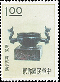 邮票图53为“战国陈侯午簋”,青铜器,高33.58厘米,深11.2厘米,口径25.5厘米,宽47.4厘米,重18.585千克。本簋为侈口圆腹曲颈龙耳方座式簋,束颈折肩,圈足极低,下连方座。腹两侧有“乙”字形直上龙形耳,腹部及方座均饰波曲纹,腹内铭文10行35字:“惟十又四年,陈侯午台诸侯献金,作皇妣考大姒祭器赙敦,台登台尝,保有齐邦,永世毋忘。”陈侯午即《史记》中的田齐桓公。现藏于台北故宫博物院。