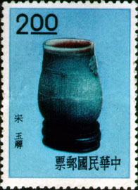 邮票图59为“宋代玉觯”,高11厘米,口纵4.7厘米,横5.9厘米,底纵3.2厘米,横5.9厘米,配有木座。觯(zhì)是晚商至西周中期的饮酒器,至西周晚期青铜觯已经很少见。这件宋代仿古玉觯,敛口,宽颈,垂腹式,以青玉琢制而成。现藏于台北故宫博物院。