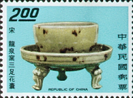 邮票图69为“宋代龙泉窑三足花囊”,龙泉窑瓷器,器高16.5厘米,口径16.8厘米,底孔径9.5厘米。花囊又名花薰,许之衡《饮流斋说瓷》记载“花薰之用如花囊贮花其内,而透香于外也,故必透雕。形式种种不一,有似瓶者,有似罐者。”这件花囊呈碗状,平面盘口,直壁,下有托盘,有三兽型足,顶部开圆孔若干,便于透香。粉青釉,并有褐釉点彩,造型华美。现藏于台北故宫博物院。