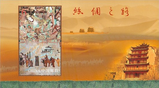 图D99-D103:丝绸之路5枚/2012-19/202.8.1/陈景异 惠斌 李群/(D28) “丝绸之路”是德国地理学家李希霍芬1877年命名的一条古代中西方间的商路。现代学者对其又有了新的认识,认为若按历史时期划分,则有先秦、汉唐、宋元和明清四条丝路;如按路线划分还有陆上丝路和海上丝路之别。而陆上丝路又因地理走向不一,可细分为北方丝路和南方丝路。北方丝路由黄河中下游通往西域,包括草原森林丝路和沙漠绿洲丝路;南方丝路即“蜀-身毒道”,因其穿行于横断山区又称高山峡谷丝路。唐中叶后,由于战乱频繁,道路受阻,陆上丝路逐渐由海上丝路取而代之。丝绸之路的开辟,极大地促进了东西方经济、文化、宗教、语言的交流和融汇,推动了科技进步、文化传播和物种引进,堪称人类文明史上的伟大创举。“丝绸之路”是西汉张骞出使西域开辟的经甘肃、新疆,到中亚、西亚并联结地中海各国的陆路(后增加海路)通道,在通过这条漫漫长路进行贸易的货物中,以产自我国的丝绸最具代表性,“丝绸之路”因此得名。中国邮政于2012年发行“丝绸之路”邮票及小型张一套。本套邮票布局依照丝绸之路自东向西的路线来设计,精选丝绸之路中国段极具代表性的历史遗迹和出土文物,在设计上把底图贯穿一体,通过山脉和地貌的变化,体现出丝绸之路沿线各地的特色,近景采用唐三彩胡人伎乐俑、马踏飞燕、波斯鎏金银壶、仙人骑马玉饰等精美文物表现丝绸之路在东西方文化交流中所发挥的关键作用;中、远景则分别选取了大慈恩寺与大雁塔、白马寺,阳关和玉门关,须弥山石窟,楼兰故城佛塔和三间房、土楼山,克孜尔石窟和尕哈烽燧、台藏塔、高昌故城等历史遗迹和胜地;近景下方均为织锦文物,仿佛向人们展现了一条悠长而宽阔的“丝绸之路”,整体色调为土黄色,体现厚重的历史感和丝绸之路所经过西北地区的主题景观特色。 图D99为“千年帝京”,画面主图为大慈恩寺里的玄奘三藏院与大雁塔;前景为唐三彩“单峰骆驼和牵驼俑”;下方是一块“联珠红地对马文锦”;远景为洛阳白马寺,表现了洛阳、长安作为汉代东西两京这两大丝路东方起点的风采。唐代创建的大慈恩寺位于古都西安南郊,是世界著名的佛教寺院,唐代长安的四大译经场之一,也是中国佛教法相唯识宗的祖庭;玄奘三藏院,位于大慈恩寺内,占地5000平方米,三藏地宫金碧辉煌,供奉佛陀舍利、玄奘法师顶骨舍利、贝叶经、唐代佛像等珍宝;大雁塔位于大慈恩寺内,是西安市的标志性建筑,塔高64.5米,共七层,塔底呈方锥形,底层每边长25米;创建于东汉的白马寺位于河南省洛阳市,为中国第一古刹(见图112介绍),有中国佛教的“祖庭”和“释源”之称,作为中国第一座寺院,在中国佛教和中外文化交流史上占有极其重要的地位;唐三彩是一种盛行于唐代的陶器,以黄、褐、绿为基本釉色,“单峰骆驼和牵驼俑”于1973年出土于咸阳渭城区渭阳镇双泉村契必明墓,高81厘米,长56.8厘米,现藏咸阳博物馆,国家一级文物;“联珠红地对马文锦”制造年代为唐代,材料为丝质,出土地为新疆吐鲁番阿斯塔那北区唐墓302号墓,主纹由两条横向排列的椭圆圈组成,有两组马纹,上行对马一前足腾起,作行走状,下行作俯首食草姿态,两者相同处在于肩背长有双翼,联珠纹外围则饰以六、八瓣小朵花,下排马足下为莲花纹,联珠纹中间饰以忍冬花纹。唐锦中,联珠纹锦属前期的典型品种,现藏新疆自治区博物馆。 图D100为“大漠雄关”,画面主图为玉门关、汉长城、阳关;前景为“马踏飞燕”;下方是一块“胡王锦”;远景为宁夏固原市须弥山石窟,表现了丝绸之路上大漠雄关的风采。玉门关位于甘肃敦煌市西北90公里处,丝绸之路南路必经的关隘、为当时对西域交通的门户,始置于汉武帝时,因西域输入玉石时取道于此而得名;阳关位于敦煌市西南70公里处,因在玉门之南,故称阳关,丝绸之路南路必经的关隘,始置于汉武帝时;马踏飞燕为东汉青铜器,1969年出土于甘肃省武威雷台墓(详见第一章图90介绍);“胡王锦”制造年代为北朝,出土于1964年新疆吐鲁番阿斯塔那18号墓,典型对称形式的联珠纹代表作,以西域的现实生活为题材,以牵驼人和骆驼为主体纹样,再现了一幅边塞驼饮的画面,沿袭汉代丝织品设计纹样中纳入汉字的特点,在适当的位置书写汉字“胡王”二字以画龙点睛,因而得名“胡王锦”,现藏新疆自治区博物馆;须弥山石窟为佛教石窟寺,位于固原西北55公里寺口子河北麓山峰上,始建于北魏,西魏、北周、隋、唐继续营造,现存石窟150多座,分布在连绵2公里的8座山峰上,自南而北大佛楼、子孙宫、圆光寺、相国寺、桃花洞、松树洼、三个窑、黑石沟8区。 D101为“神秘故国”,画面主图为楼兰故城遗址;前景为鎏金银壶;下方是一块“唐黄地宝色绣鞯”;远景为青海省西宁市土楼山,表现了丝绸之路上神秘故国的风采。举世闻名的楼兰古城位于新疆巴音郭楞蒙古自治州若羌县北、罗布泊的西北角,处于西域的枢纽,在古代丝绸之路上占有极为重要的地位(详见图D96、D97说明);鎏金银壶为波斯萨珊王朝器物,1983年出土于宁夏固原市原州区南郊乡深沟村李贤夫妇合葬墓,通高37.5厘米,重1.5公斤,高长身,卵形腹,细颈、鸭嘴形流,圆形底座,弯曲两端成羊头,顶端铸1人头,高鼻戴圆形帽,壶身腹部锤一周突起的3组6人男女图象,一组为裸体,其主题图案描绘的是古希腊神话故事,