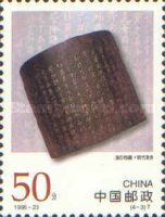 图D161-D164:中国古代档案珍藏4枚/1996-23/(D44) 我国作为具有悠久历史和人类文明的世界古国之一,档案事业亦起源很早,殷商盘庚时代,就已设立了由国家管理的档案库,珍重地保藏了一些具史料价值的甲骨卜辞,以供执政者处理国家大事参考之用,春秋末期至魏晋时代,“档案”一词已经出现,当时的边关文字多写在木牍上,往来传递,这种“木牍”叫牌子,积累多了就用皮条串起来挂在墙上,叫“档子”,档子贮存年久者便叫“档案”。为祝贺第13届国际档案大会于1996年9在北京召开,中国邮政发行了“中国古代档案珍藏”特种邮票。 图D161为“甲骨档案·商代龟甲”,甲骨文是我国现存最早的文字,因而当时刻在龟甲上的人类活动记录便成了最早的档案资料,龟甲除刻有占卜活动的卜辞外,还有记录刻辞和表谱刻辞,是当时的政事记录和商代王家的重要档案。邮票画面上的这块龟甲,是1991年10月从河南安阳花园村东的殷墟出土的一块完整的商代后期的刻辞卜甲,编号为“91花东H3.52”,卜甲长19厘米,宽11.5厘米,上面刻有54个字,内容是卜问一位地位很高的贵族外出打猎,能否遇到野猪、鹿等动物,以及能否将它们猎获。这块卜甲出土的窖穴长2米,宽1米,共出土甲骨1583片,其中刻辞甲骨579片,特别珍贵的是这批甲骨以大版的卜甲为主,完整的有字卜甲近300版,这是自1899年、1936年和1973年以来,殷墟甲骨文的第四次重大发现,画面背景为另一块殷墟出土的刻辞卜甲(《殷墟文字甲编》3918号),使图案更具阴冷神秘的时代特征。 图D162为“简牍档案·汉代木牍”,在中国古代纸张出现以前,竹木曾作为一种公私文书的载体,成为普遍使用的书写材料,称作简牍。1993年,在江苏省连云港市东海县温泉镇尹湾汉墓出土了一批木牍和竹简,其中六号墓中出土的“集簿”等10余方木牍和“东海郡属吏行视日记”等70余支竹简,上面详细记载了东海郡的上级、行政建制、吏员设置、任命、升迁、考勤、巡行视察等情况,是迄今已发现的我国最早和较为完整的一份郡级行政单位文书档案。邮票画面上的木牍长23厘米,宽7厘米,出土于6号墓,根据内容暂定名为“占取(娶)妇嫁女、问行者、问墼者、问病者、问亡者等的术数图局”,画面背景为一块同样大小的木牍,作了局部放大,它的正、反两面均用恭谨的隶体墨书竖写,共4000多字,暂定名为“太守·都尉府暨县、邑、候国吏员集簿”,图案色彩与龟甲不同,呈现出一种木质的暖和的感觉。 图D163为“金石档案·明代铁券”,铁券为铁制契券,示坚固永久之意,是封建帝王用以巩固其统治地位的手段之一,最早的铁券是汉高祖刘邦与功臣定誓用的丹书铁券,到了隋唐时已相当盛行,明代铁券是我国铁券的重要组成部分。80年代中期,青海省档案局在出资从西宁郊区征集进馆一件明代铁券,该铁券长37.5厘米,宽21.2厘米,厚2厘米左右,重1300克,正面206字,反面11字,共217字,均为颜体,金锉方法,字清基本完整无损,是明英宗朱祁镇于天顺二年(公元1458年)三月十八日,赐给军功卓著的高阳伯李文的,写有食禄一千石和免本人死罪一次的待遇,李文的祖父在明洪武初年因军功被授予西宁州同知,后又升任西宁卫指挥佥事,李文的后代为清代的土司,现今在青海省民和县、大通县、西宁市均有其后裔,现存的民和县、大通县景阳乡两本李氏家谱中对这件铁券均有记载。该铁券是我国档案界保存很少的铁券之一,1991年曾将它的复制件运往加拿大展览,在国际上引起轰动。 图D164为“纸质档案·清代国书”,国书为各国元首之间为派驻大使或遣使访问、相互往来的正式文书。由于鸦片战争的失败和列强的入侵,清代紧锁的国门被强行打开,近代外交的出现诞生了清朝国书。邮票画面上展示的这件清代国书,系光绪三十一年(公元1905年)八月,光绪皇帝派载泽等3人赴比利时考察政治,向比利时国君递送的国书。该国书系满、汉文合璧、纸质,长220厘米,宽235厘米,折叠式,黄色墨书,外加龙纹彩边,封底、封面系金丝和绒线绣制的真龙形象,国书置于黄缎函套之中,函封上端书满、汉文字“大清国国书”,函套之外,加以红面黄底锦匣,装璜极为精致。该国书的内容首先是光绪皇帝向比利时国君问好,讲述两国友谊;接着介绍镇国公载泽、署兵部左侍郎徐世昌、商部右丞绍英赴比国考求政治,以便清政府研究采用;最后希望比君“推诚优待”。国书末的时间为“大清光绪三十一年八月初九日”,并加盖满、汉文合璧的“皇帝之宝”印玺。此件国书本应由载泽等到比利时后向比君亲自递送,但事有骤变:当年八月二十七日,正当载泽等从北京东车站登车启程之际,忽遭革命党人吴樾投掷炸弹,数人受轻伤,载泽等无恙,于是遂中止出发,故而此件国书留下未发,以后一直存放宫中,现收藏在北京故宫西华门内北侧的中国第一历史档案馆内,编号为“宫中档·外事往来478”。