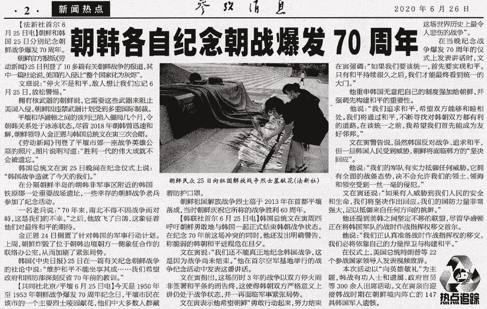 朝韩各自纪念战争爆发70周年 参考消息 20200626