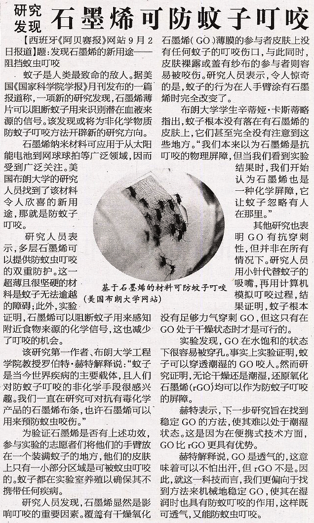石墨烯可防蚊子叮咬[参考消息20190904]