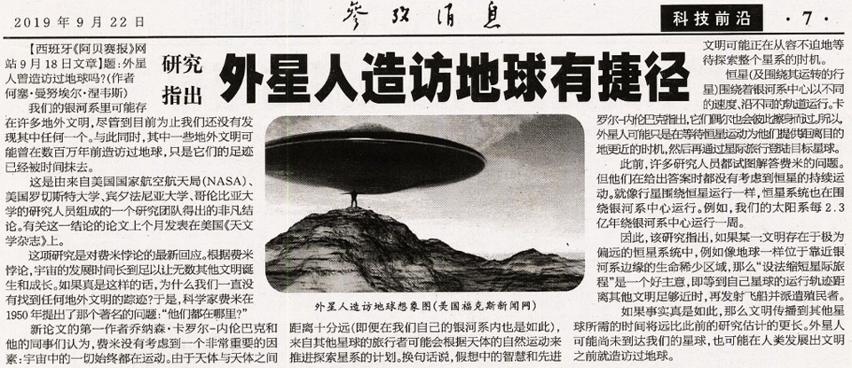 外星人造访地球有捷径 参考消息 20190922
