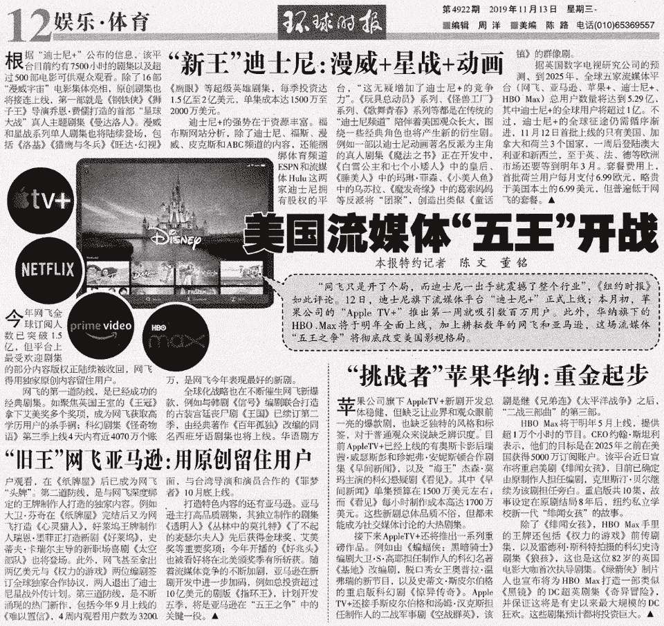 美国流媒体“五王”开战 环球时报 20191113