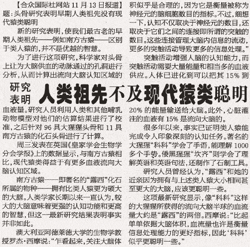 人类祖先不及现代猿类聪明 参考消息 20191115
